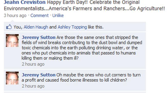 My friend Alden Haugh, texted me to alert me that some negativity towards our great food producers was happening on a mutual friend’s facebook wall. I bopped over there quick and was disappointed to see this statement.