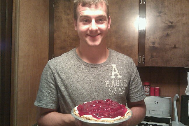 Due to a recent development in the honeymoon-to-Fiji-in-exchange-for-angel-food-cake saga, I made a cheesecake last night. The NInja informed me that a cheesecake or pie counted for two angel food cakes so voila! I am done with #’s 4 and 5. It’s a mighty tasty little devil if I do say so myself 😉