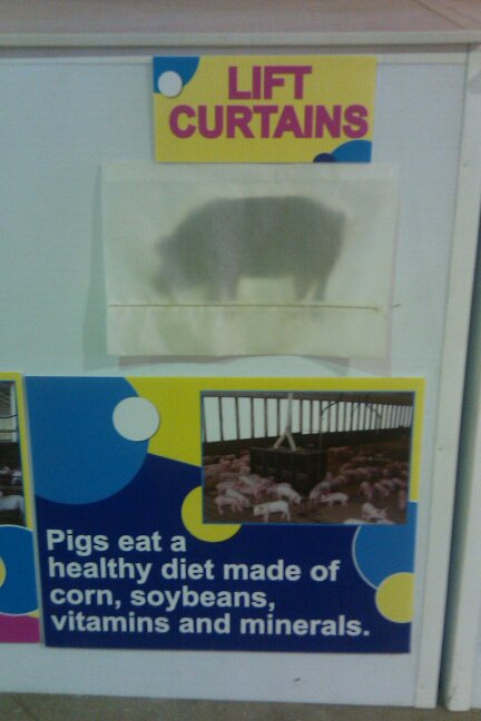 My first day in Columbus I wandered the fairgrounds for awhile looking at the exhibits and resisting the fried food stands. I was pleasantly surprised at the number of consumer education booths I kept encountering. In almost every building I entered, there was a booth or display that provided consumers a first hand view at how Ohio produces a safe, wholesome food supply. Take a look at what I found in the swine barn – there were four viewboxes set up to show fair-goer’s how hogs are cared for on a farm.